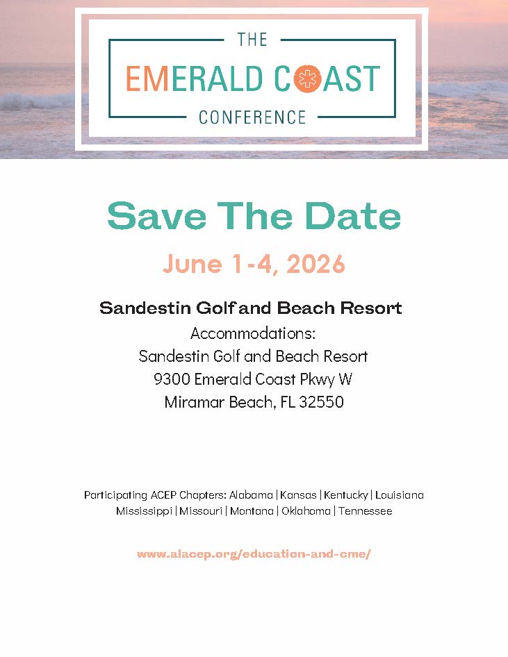 Join us this summer for the annual EMerald Coast Conference and earn CMEs in your sandals! Come examine Emergency Medicine trends, then catch up with friends – and bring your family to play on the Panhandle! We’re bringing together the best and the brightest of our participating ACEP chapters to cover a wide range of topics including sessions on leadership, burnout and advanced imaging.